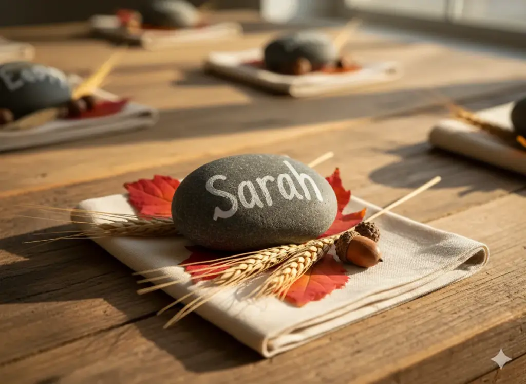 Last Thanksgiving, I created placeholders using smooth river rocks I’d collected during a summer camping trip. I painted each guest’s name on a rock with white acrylic paint (the washable kind so I could reuse the rocks later), and people loved them so much they took them home. Several friends texted me later saying they’d used their rock as a paperweight or garden marker.