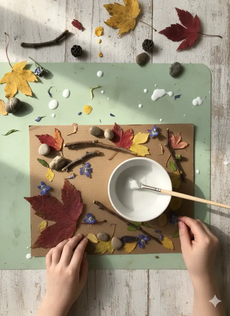 Nature collages are my secret weapon. I send the kids outside with a bag (we use reusable grocery bags) and tell them to collect whatever they find interesting: leaves, small sticks, flower petals, interesting rocks, seed pods. Then we arrange them on cardboard (I save every box that comes to my house) and glue them down with regular white school glue or flour paste (just mix flour and water until it’s thick like glue—totally non-toxic).