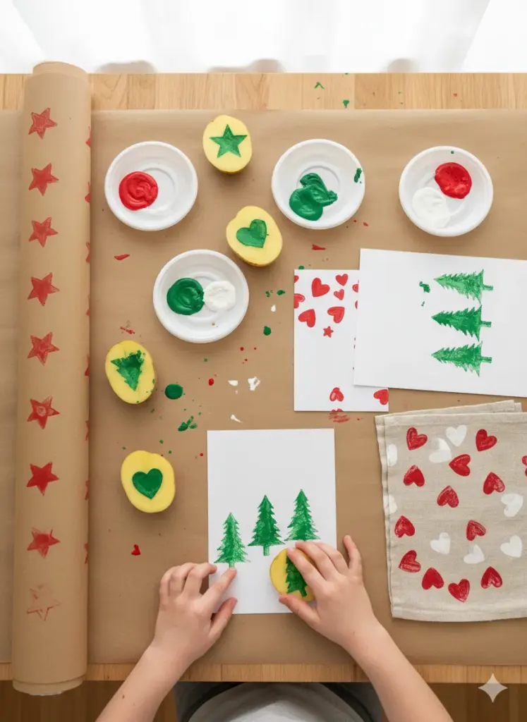 Potato stamps are another winner for any holiday. Cut a potato in half, carve a simple shape into the flat side (stars, hearts, trees—keep it simple or you’ll be there forever), and let kids stamp onto fabric or paper with non-toxic paints. We’ve made holiday cards, wrapping paper, and even table runners this way. The potatoes compost when you’re done, and kids think it’s hilarious to craft with vegetables.