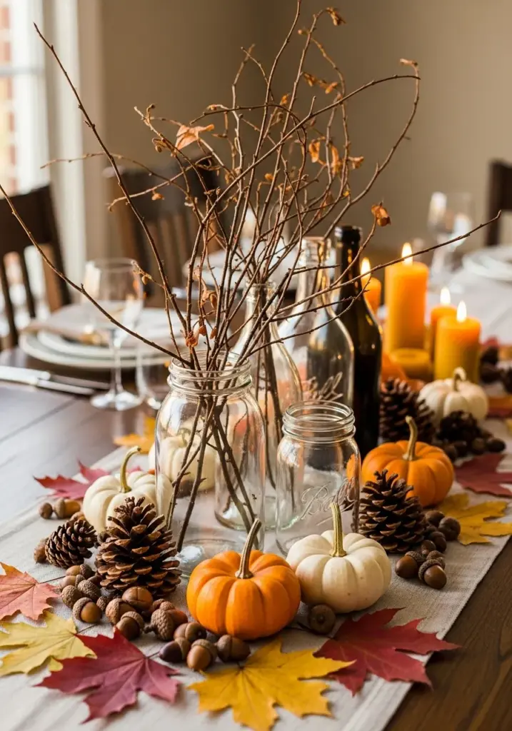 My go-to Thanksgiving centerpiece is ridiculously simple: I collect interesting branches from my yard (look for ones with cool shapes or remaining leaves), spray the cut ends with a bit of water, and arrange them in vintage bottles or mason jars I’ve picked up at thrift stores. Between the branches, I tuck in whatever I can find—mini pumpkins from the farmers market, pinecones, acorns, or even just colorful leaves pressed between book pages to flatten them.